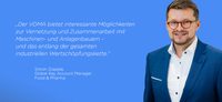 Rund 3.000 Mitglieder hat der VDMA und ist damit die größte Netzwerkorganisation für Maschinen- und Anlagenbauer in Deutschland und Europa. „Über den VDMA und die VDMA AG Medizintechnik haben wir einen exklusiven Zugang zu Unternehmen“, erzählt Simon Zoppke, Global Key Account Manager Food & Pharma. Die VDMA AG Medizintechnik mit mehr als 300 Mitgliedern bildet eine eigene Plattform und beschäftigt sich mit produktionstechnischen Fragestellungen– entlang der gesamten Wertschöpfungskette. Die Bereiche Food, Pharmazie und Life Sciences sind eng verwandt mit der Medizintechnik. „In beiden Bereichen sind die regulatorischen Anforderungen an die Produkte sehr hoch. Daher sind viele Unternehmen in beiden Bereichen aktiv“, so Zoppke.